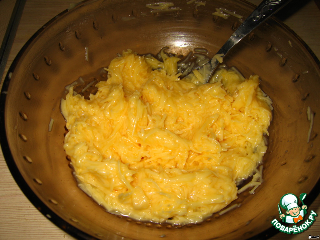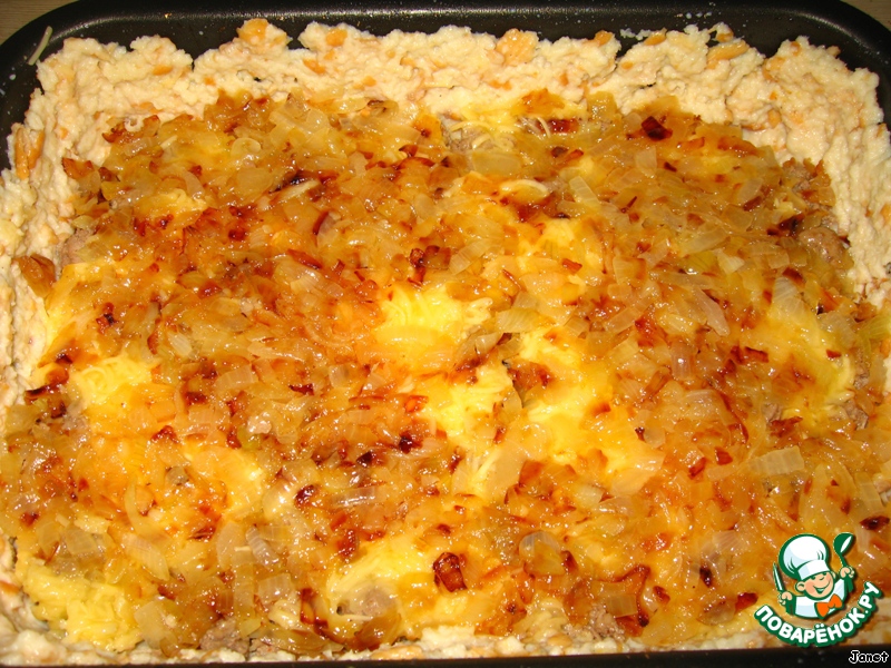 150 г сыра натереть на тёрке, добавить 2 яйца, перемешать - это у нас начинка, вместе с жареным луком.