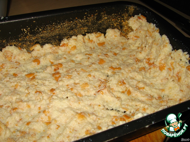 Помолоть в блендере 25 г кешью, добавить 4 ст. л. сухарей молотых и обсыпать ими форму (у меня 25х18 см с высоким бортиком), смазанную рафинированным маслом.