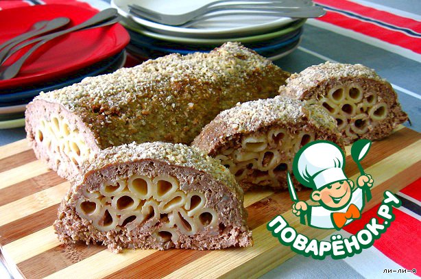 | Рецепт этого блюда был размещен на сайте в 2008 году пользователем elena_110 под названием "Рулет с макаронами "Сытный"", и иллюстрирован мной в рамках акции «Раскраски». Очень вкусное, сытное и не очень трудоемкое блюдо! |