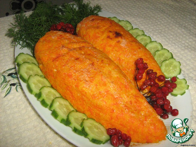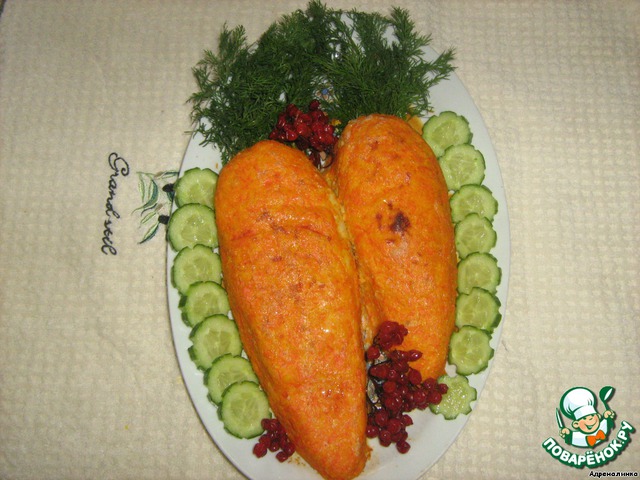 10. Этот белок спас мои морковки. Он стянул их, сделал их более плотными и яркими. Румяные морковки украшаем пучком укропа. Я их положила под рулетки. Фигурным огурчиком, ну и калинка для цвета.