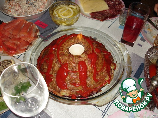 Вынуть из духовки. Полить "Вулкан" кетчупом, заполнить трещины (можно смесью с майонезом). В углубление вставить скорлупу от яйца, налить в нее спирт или абсент.
