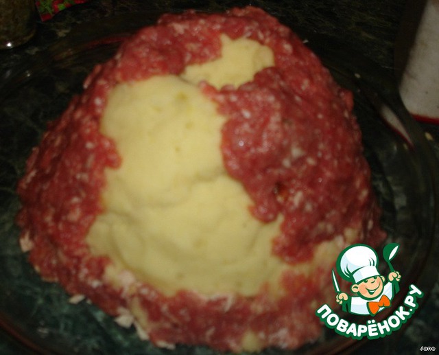 Все это облепить плотным слоем пюре. А сверху - тонким слоем фарша. Сделать сверху небольшое углубление размером в половину яйца.