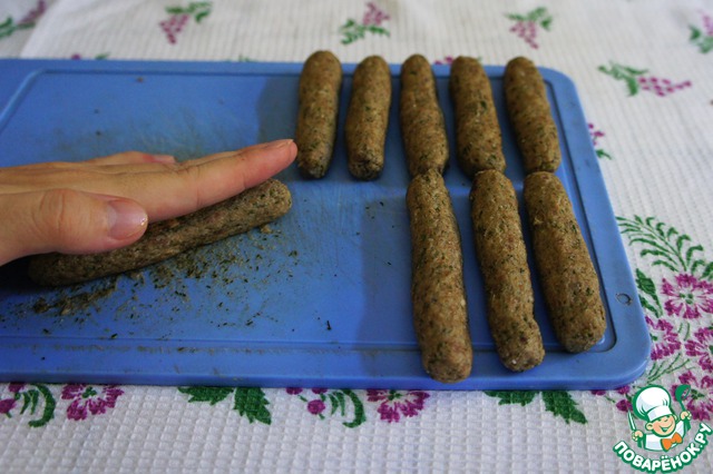 Формируем небольшие тонкие колбаски из фарша примерно таким образом, как на фото: я скатываю в руках небольшой шарик, расплющиваю его и катаю по досточке слева-направо. Колбаски получаются плотными и одинаковой толщины. Также кофту делают в виде маленьких шариков.