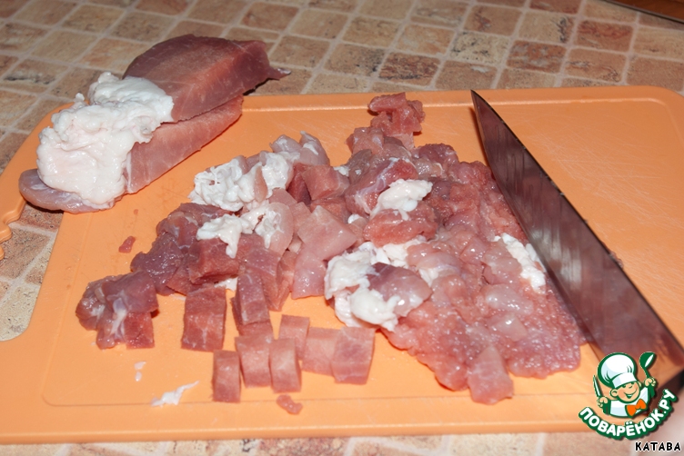 Тем временем, режем на тонкие пластинки мясо. Я всегда беру свинину и говядину в равных пропорциях - свинина придает говядине мягкость и нежность. Нарезаем пластинки на маленькие кусочки.