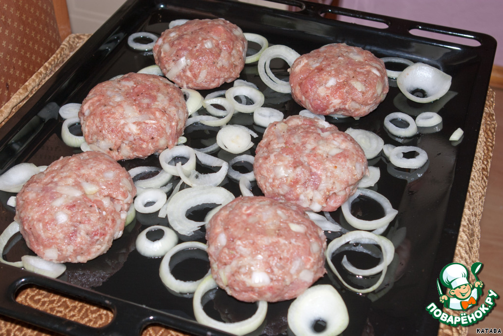 Укладываем наши колобки на лук, немного приплюснув их сверху.
