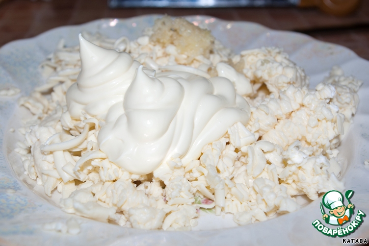 2 зубчика чеснока выдавливаем через пресс для чеснока. Можно просто мелко-мелко порубить.
