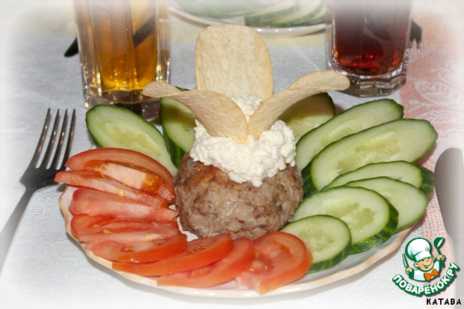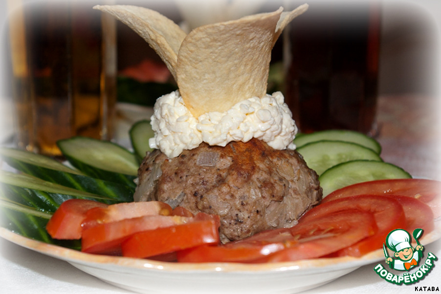 Наши бифштексы тоже уже должны быть готовы. На середину тарелки выкладываем наш бифштекс, сверху на него кладем шарик из сырного соуса, украшаем 3 "лепестками" чипсов. На гарнир прекрасно подойдут нарезанные огурцы и помидоры.