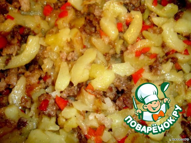 Одновременно с картофелем, в другой сковороде, жарим фарш. Солим и перчим.