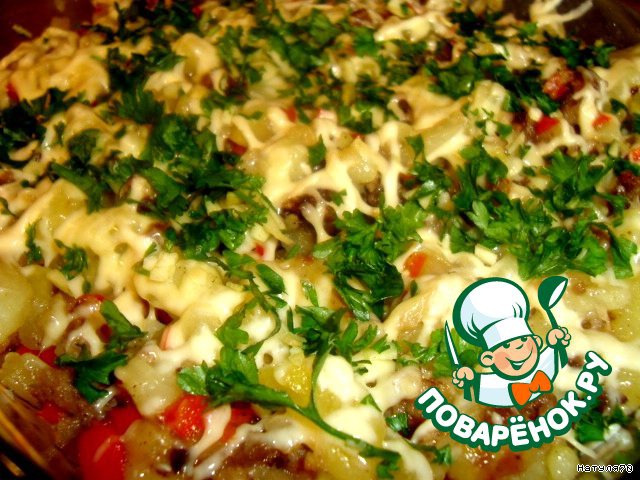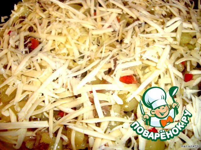 Перекладываем в форму для запекания, посыпаем натертым сыром, и отправляем в духовку на 7-8 минут.
