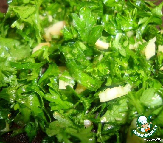 Пока картофель запекается, мелко рубим петрушку вместе с чесноком.