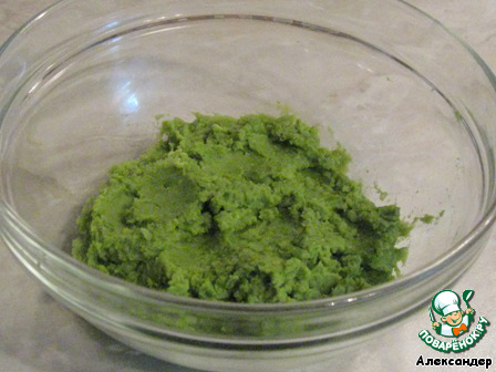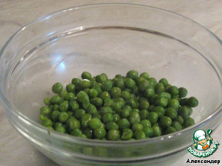 Замороженный или свежий зеленый горошек обдать кипятком. Если он мягкий, то достаточно. Если нет, как у меня, то сварить до мягкости.