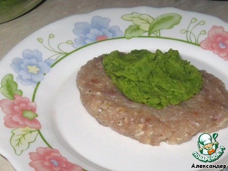 Сделать лепешку из фарша. Положить ложку горохового пюре.