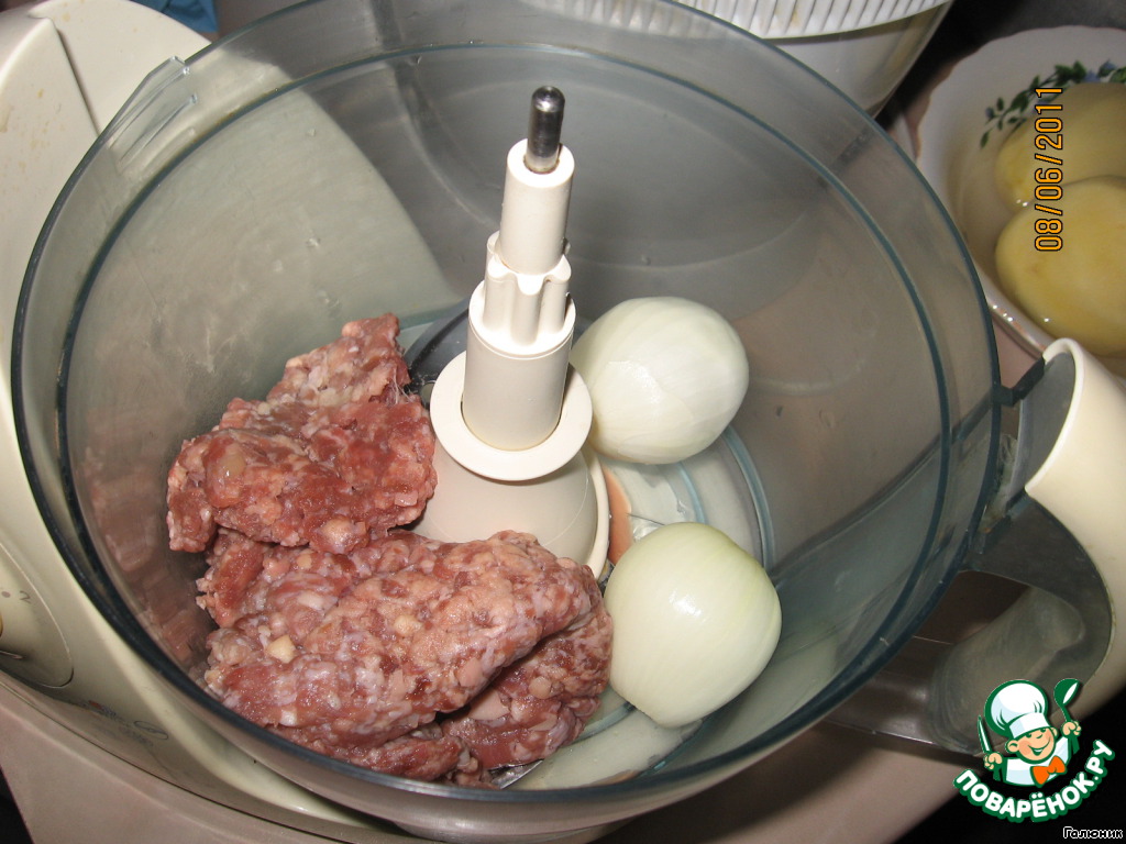 Фарш и лук прокрутить в мясорубке или, если есть комбайн, измельчить в нем.