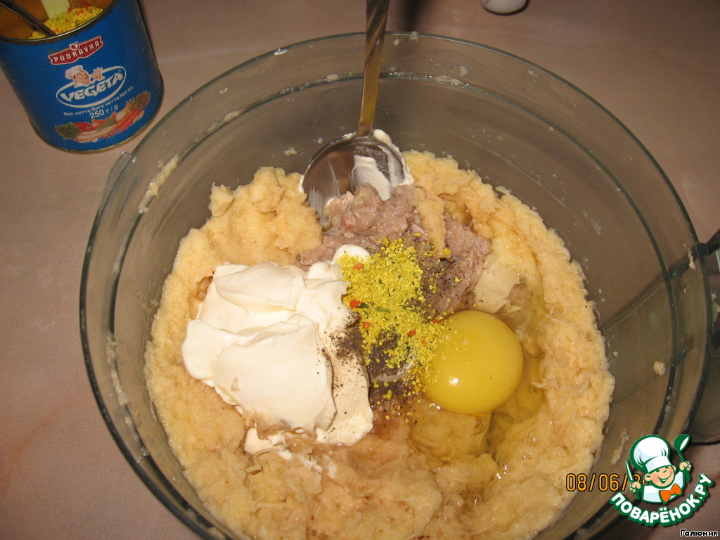 Добавить мелко натёртый картофель (сок желательно слить), яйцо, сметану, соль, перец и приправки.