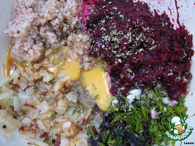 Первым делом из крупы варим кашу. А затем готовим два типа котлет - свекольные (розовые) и с копченым мясом(беленькие). Для розовых котлеток готовим фарш следующего состава. Лук слегка обжариваем, отварную свеклу чистим и трем на мелкой терке. Ее нужно отжать, чтобы избавиться от лишнего сока. Добавляем ячменную кашу, зелень, яйцо, крахмал, соль, перец по вкусу. Все перемешиваем.