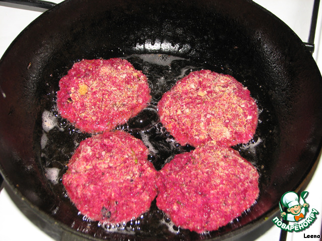 Из фарша жарим небольшие плоские котлетки, которые предварительно обваляли в панировочные сухари.
