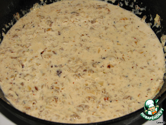 Добавляем сливки, солим и тушим несколько минут. У меня была густая домашняя сметана, я ее густоту отрегулировала добавлением молока.