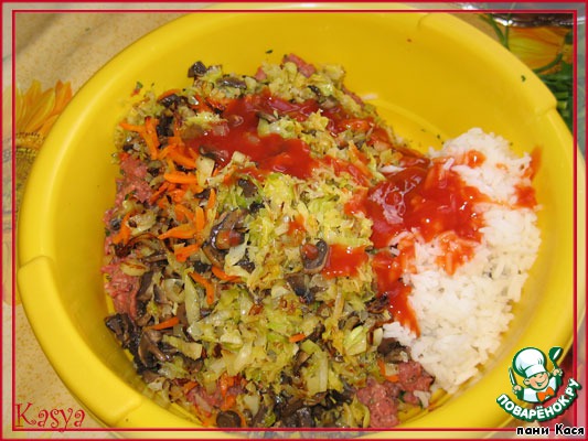 Капустой, грибами, рисом, морковкой и соусом. Солим, перчим.