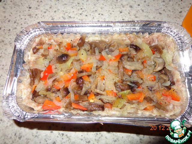 Пока фарш отдыхает, занимаемся начинкой. Лук обжариваем, добавляем грибы, солим, перчим, добавляем мелко нарезанный перчик (можно не добавлять, я сделала это для красоты) и обжариваем еще минут 5.