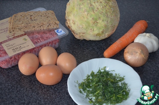 Сельдерей, морковь, лук и чеснок пропустить через мясорубку с крупной сеткой. Я тёрла на средней тёрке. Смешать с говяжьим фаршем, замоченным хлебом в молоке (хлеб отжать немного), сырым яйцом и специями.