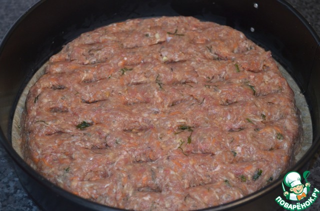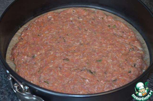 Выложить на дно формы ровным слоем подготовленный фарш.