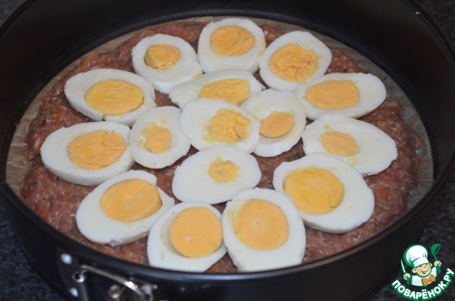 Далее, оставшийся фарш выложить равномерно поверх яичек, яйца не должны выглядывать наружу. Я с помощью чайной ложечки сделала маленькие углубления по всей поверхности.