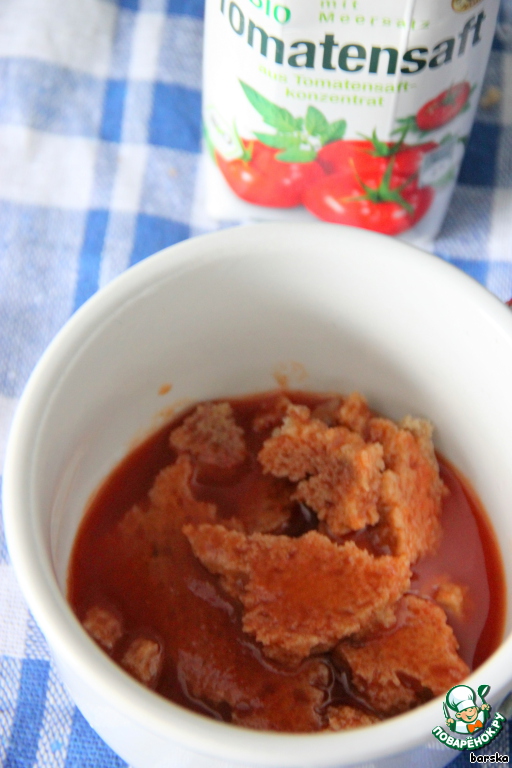 Залить мякиш хлеба (1 кусочка) томатным соком. Хлеб может быть и белым, и серым.