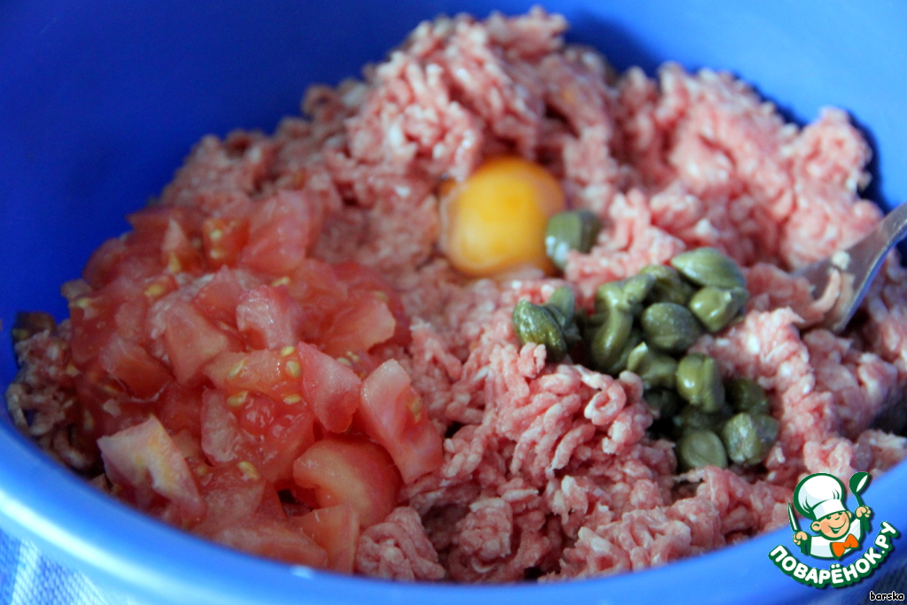 В фарш добавить яйцо, каперсы (или маринованный огурец, порезанный кубиками), кубики консервированных (свежих) помидор без кожицы.