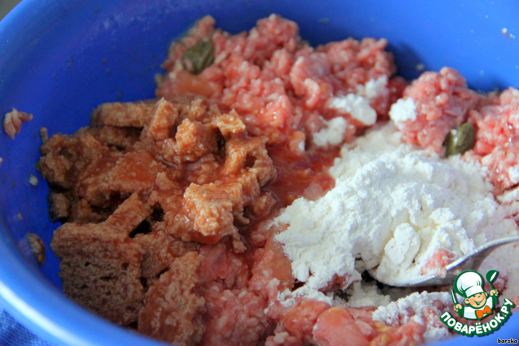 Добавить мякиш хлеба, размягчённого в томатном соке, соль, перец, муку.