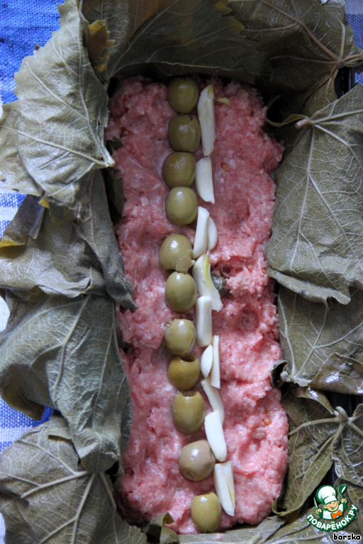 Распределить остаток фарша. И закрыть виноградными листьями.