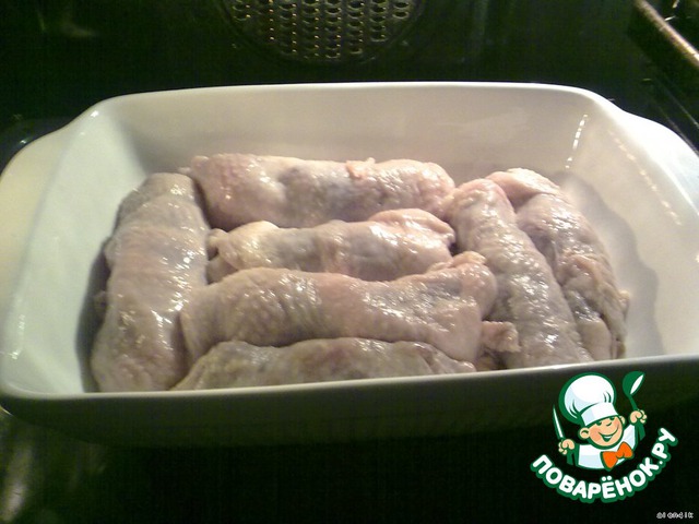 Два вида мяса перемешать. Количество мяса взято относительно. Просто у меня было всего 7 ровненьких шкурок, получилось 7 порций