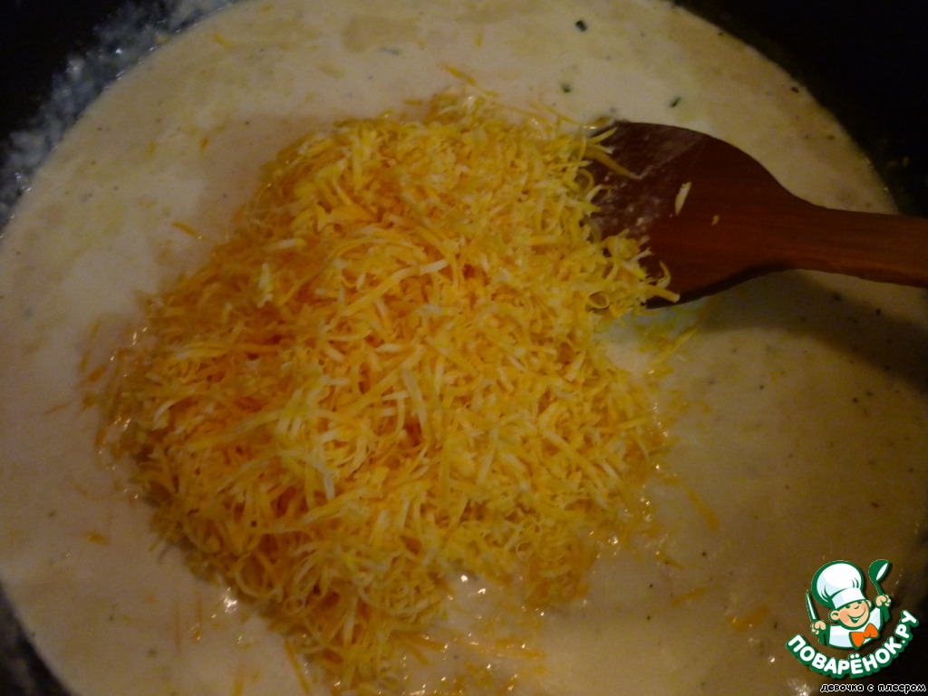 Сыр натрите на мелкой терке, добавьте в соус. Перемешайте.