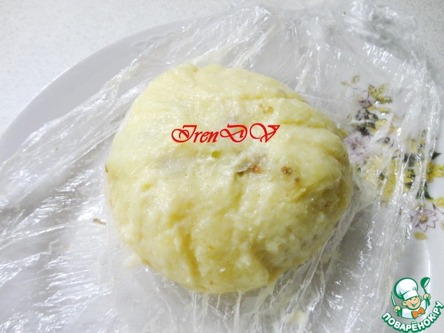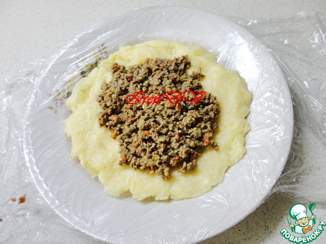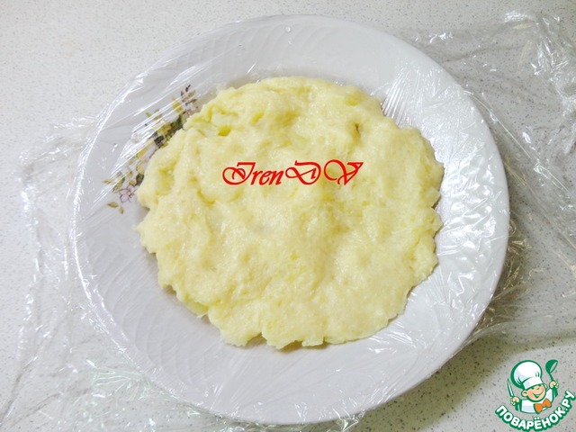 Фарш убираем остужаться, а тем временем варим картошку-в воде или на парУ. После того, как картошка сварится, тщательно сливаем с ее всю воду, подсушиваем и остужаем. Затем измельчаем в любым способом (я натерла на мелкой терке). Добавляем яйца, соль и муку и замешиваем массу для лепешек. Масса должна быть достаточно крутой и нелипкой. Делим ее на порции по 120 грамм, выкладываем одну порцию на тарелочку, застеленную пленкой и хорошо разравниваем в лепешку.