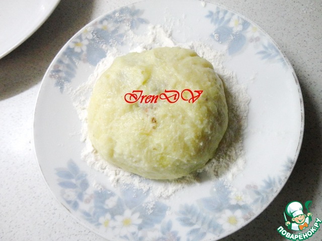 Слегка приплющиваем нашу зразу и окунаем нижнюю часть в муку.