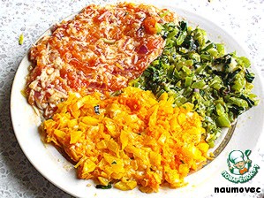Все овощи моем и чистим. Морковь трем на терке, остальное режем небольшими кубиками. Сыр трем на терке и делим на 3 части. Обжариваем отдельно помидоры с красным луком, желтый перец с морковью, зеленый перец с пореем. Смешиваем с сыром каждую зажарку.