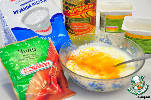 Для соуса смешайте оставшийся йогурт, сухое молоко, сахар, оливковое масло и порошок чили, посолить.