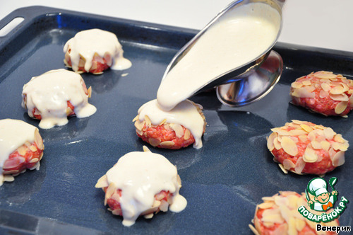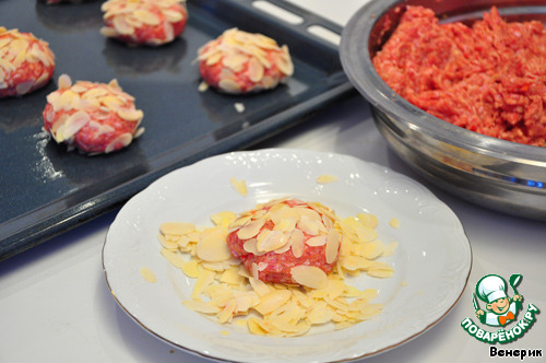 Разделить фарш на 18 частей, и сформировать из фарша шарики. Обвалять в хлопьях миндаля (в след.раз попробую хлопья предварительно обжарить), выложить на противень (не забудьте застелить фольгой, чтобы потом меньше было мыть), оставив между котлетами достаточно места, поскольку они могут увеличиться в процессе запекания. У меня получилось два противня по 9 котлет.