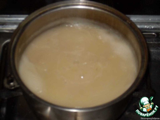 В оставшуюся часть лука добавить муку, вторую половину сливочного масла и обжарить. Массу переложить в кастрюльку, лучше всего металлическую.