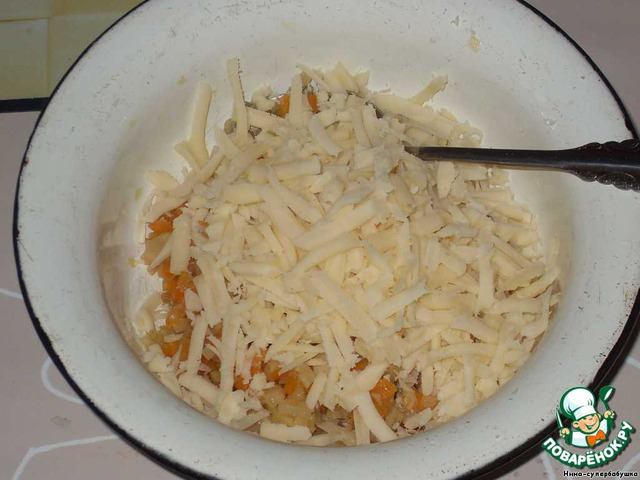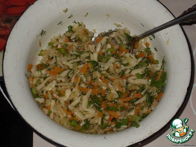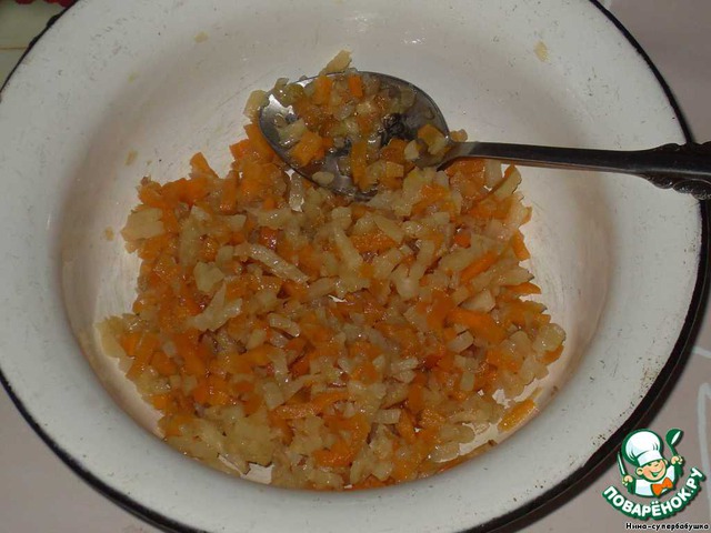 Небольшую морковку и небольшой кусочек корня сельдерея натереть на крупной терке и обжарить.