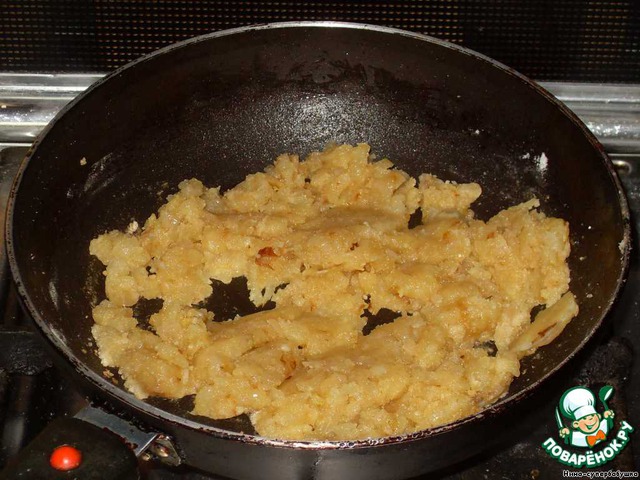 Лук нарезать очень мелко, обжарить в половине сливочного масла до золотистого цвета. Разделить лук на две половины. Одну отложить.
