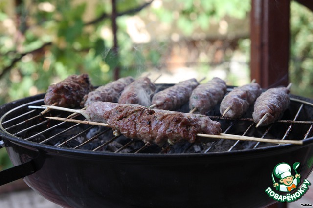 Лепим из фарша колбаски (не слишком толстые, чтобы они от тяжести не спадали с палочек) и прикрепляем их к деревянным палочкам. Желательно палочки перед готовкой замочить в воде, чтобы они не сгорели при жарке на мангале.
