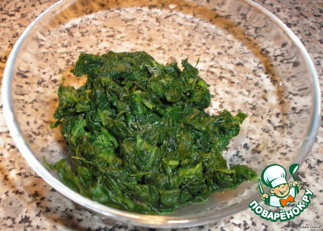 Шпинат (у меня был замороженый) кинуть в кипящую воду на 3 минуты. Затем откинуть на сито, чтобы стекла вода. Измельчить.
