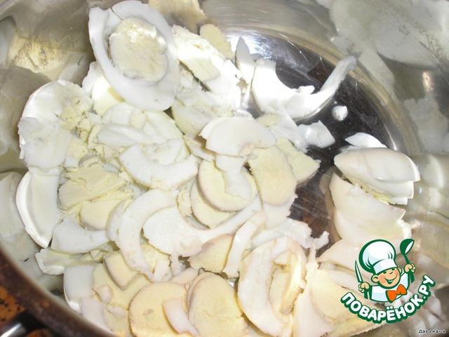 4 яйца отварить. Крупно нарезать.