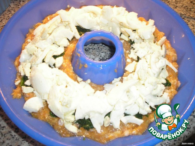 | Кольцо из куриного фарша с начинкой из рубленых яиц и шпината. Просто и очень вкусно. Кольцо получается приятного оранжевого цвета, а внутри ярко-зеленого. |