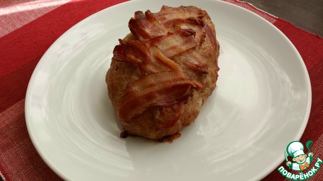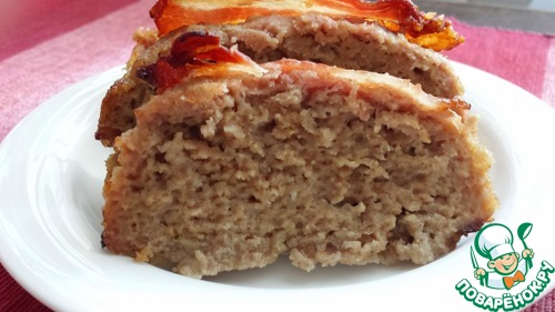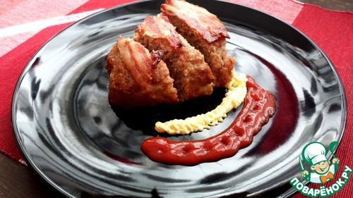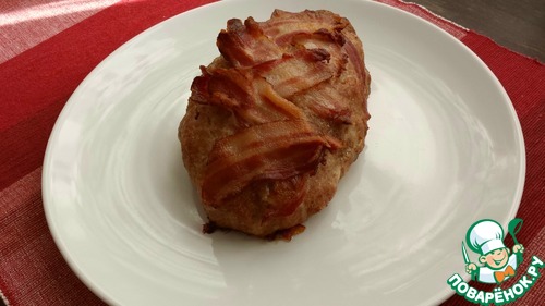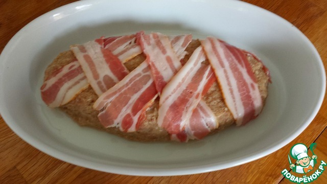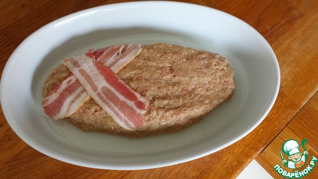 Из фарша делаем хлебец. Сверху кладем бекон (на Ваше усмотрение).