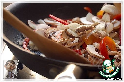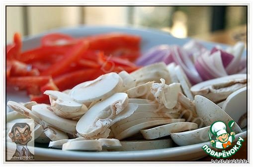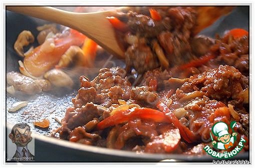 Ну, хватит вступлений, нам понадобится полкило фарша (смешанного), болгарский перец, лук, грибы (если свежих нет, то вариант из банки), 2-3 столовых ложки томатной пасты, 2/3 стакана воды, разбавленной столовой ложкой с верхом муки;