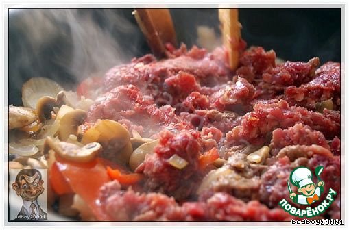 Добавляем фарш, солим и перчим по вкусу, хорошо разбиваем мясные комочки
