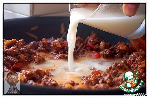 вливаем в уже готовый фарш и, постоянно перемешивая, жарим, пока жидкость не впитается.
