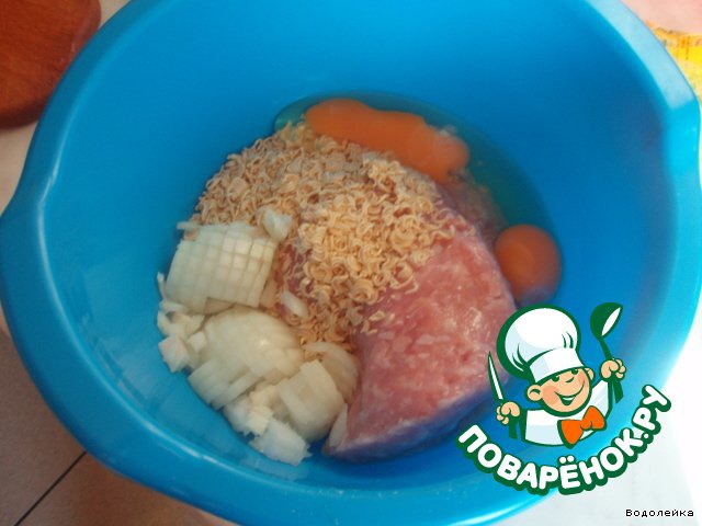 Лучок режем помельче кубиками. Соединяем наши продукты: фарш, лук, вермишель, яйца.