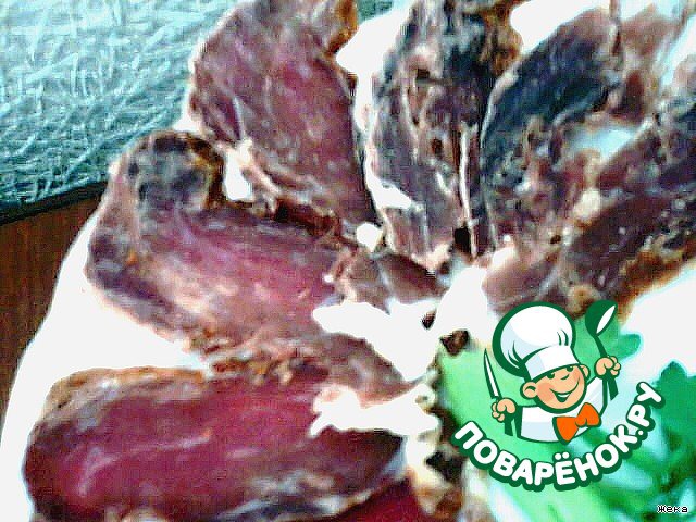 Обваливаем в соли и приправах, укладываем в лоток, сбрызгиваем водкой и выдерживаем в закрытой посуде 12 -14 часов, периодически переворачивая и сливая выделившийся сок (в холодильнике, на нижней полке),